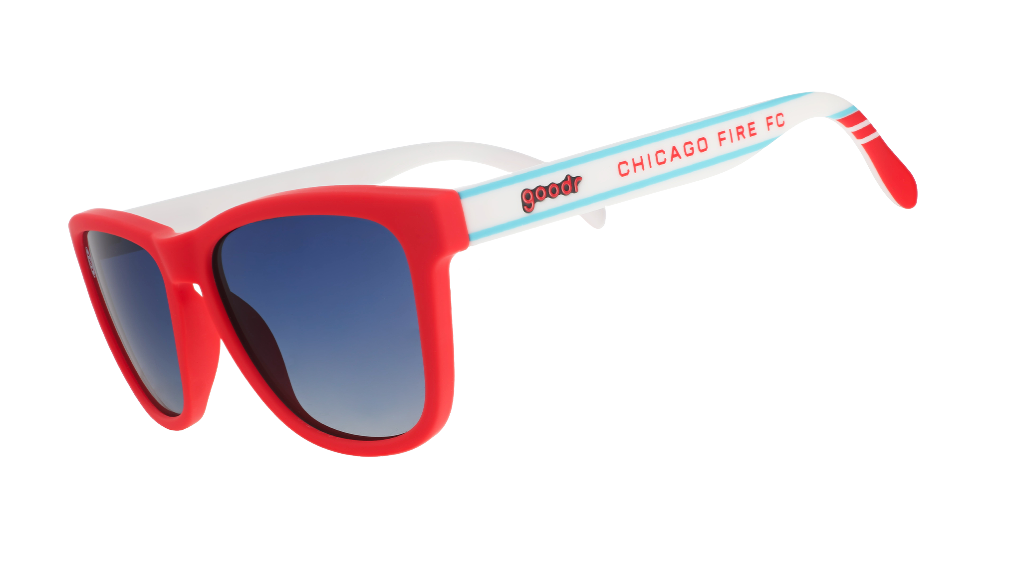 Chicago Fire FC fans need hot sunglasses. These red and white frames with dark blue ocean gradient lenses whisper, "You absolutely can survive another Midwestern winter." Packed in Major League Soccer packaging more eye-watering than a deep dish pizza. Almost. (Yeah, this copywriter took a side on NYC pizza vs. Chicago pizza, deal with it.)