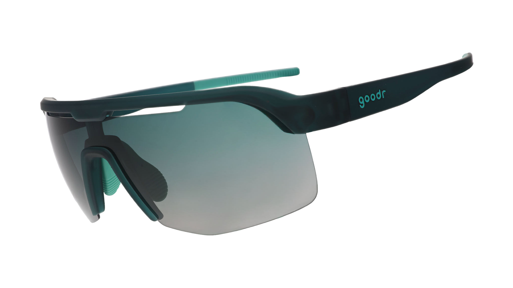 Teal Bolt Gs w/ green gradient lenses stay put & look sharp while attempting epic feats of athleticism, e.g. maintaining composure & not squealing in agony after leapfrogging full speed over a fire hydrant & accidentally landing on your padoobies.